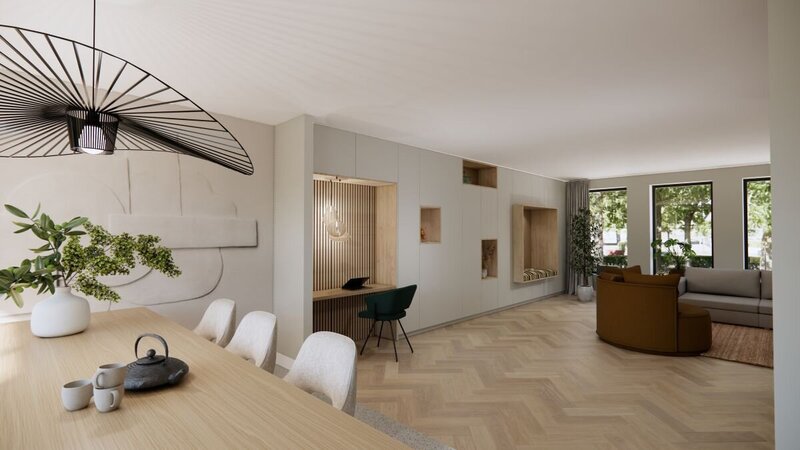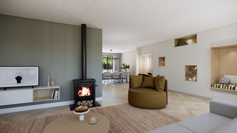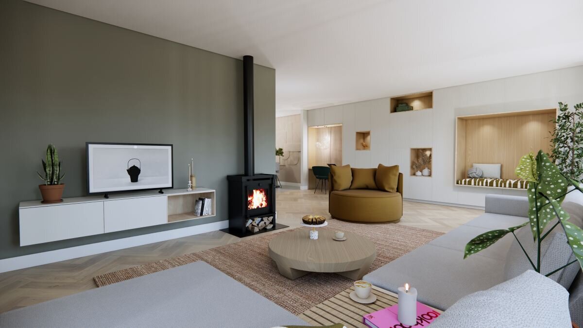 Om meer balans te creëeren, koos ik in het ontwerp voor grote gebaren zoals een maatwerk kastenwand. De bewoners hadden hier zelf ook al aan gedacht maar durfden het nog niet aan. Met de foto-realistische 3D beelden was de keuze snel gemaakt en viel alles op z'n plaats.